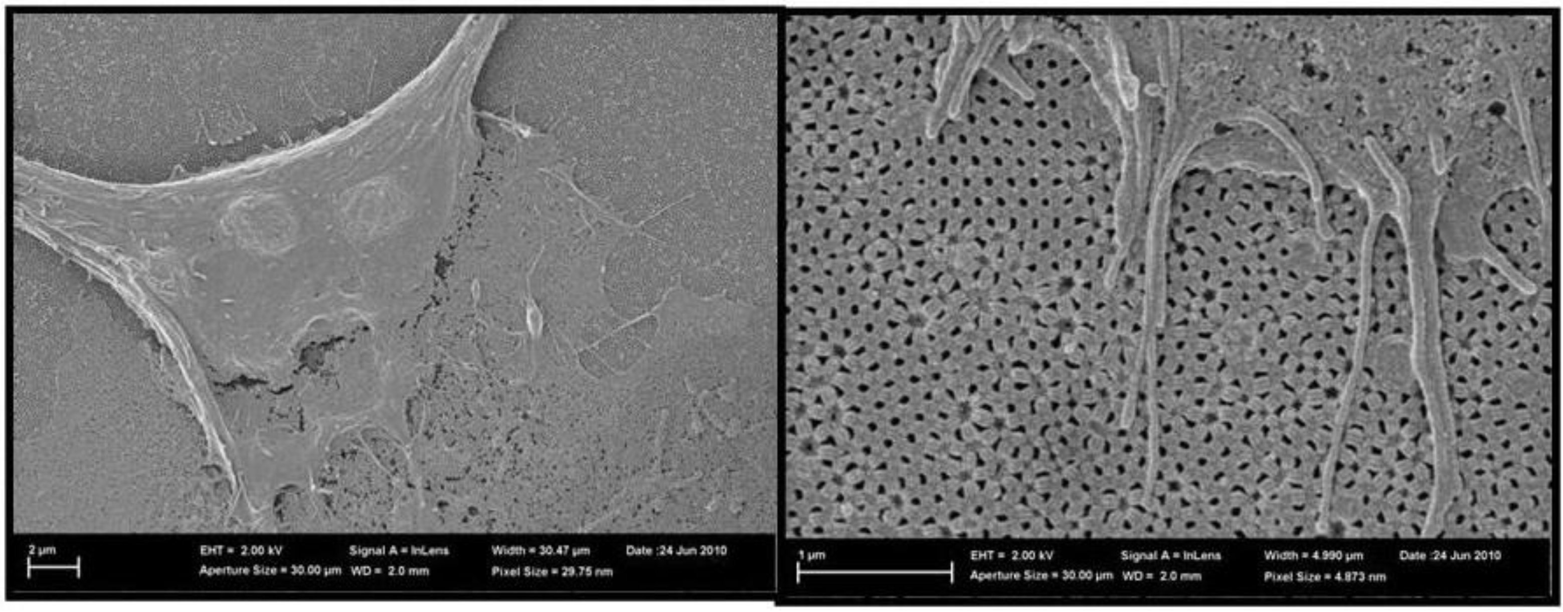- Karlsson, M.; Pålsgård, E.; Wilshaw, P.R.; Di Silvio, L. Initial in vitro interaction of osteoblasts with nano-porous alumina. Biomaterials 2003, 24, 3039–3046. [Google Scholar] [CrossRef] [PubMed]