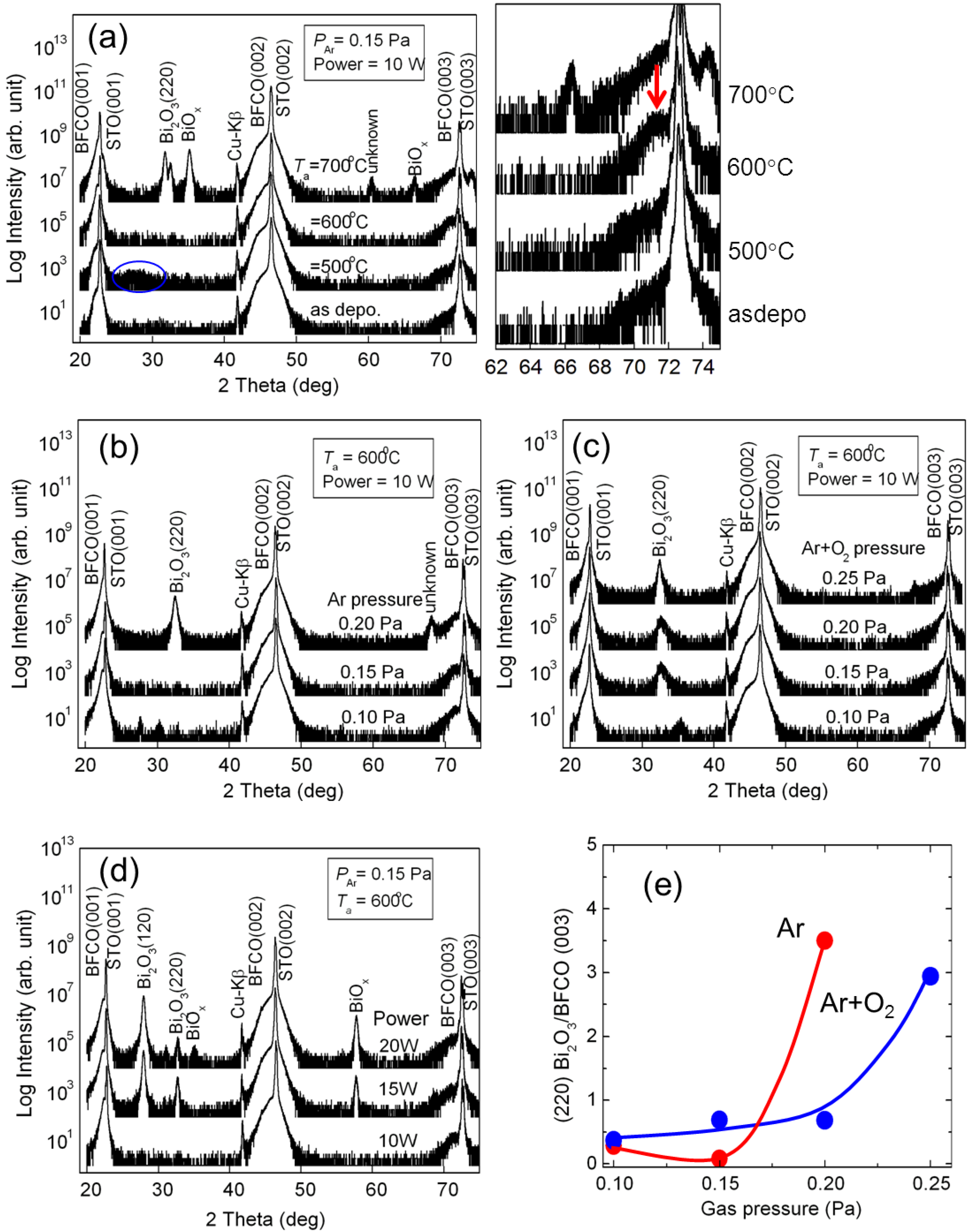 (a) X-ray diffraction (XRD) patterns for the Bi(Fe0.9Co0.1)O3 films annealed at different temperatures, (b) and (c) Ar and Ar + O2 (3:1) gas pressure dependence during sputtering, (d) Input power dependences of the XRD patterns at Ar gas pressure of 0.15 Pa annealed at 600 °C, and (e) Ar and Ar + O2 gas pressure dependence of the XRD peak intensity ratio of (200) Bi2O3/(003) Bi(Fe0.9Co0.1)O3. A single phase Bi(Fe0.9Co0.1)O3 film was formed with low Ar gas pressure and annealed at 600°C in air.