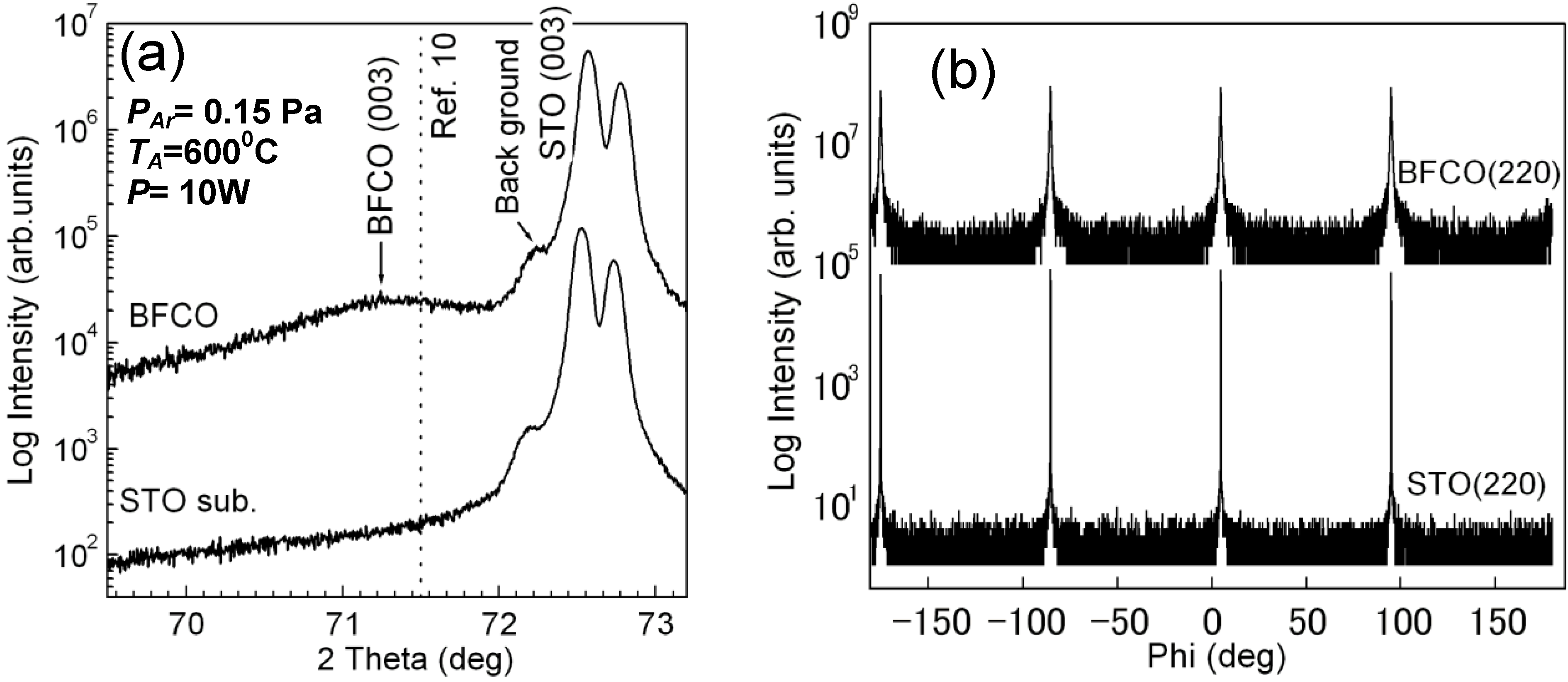 (a) XRD profile around Bi(Fe0.9Co0.1)O3 (300). The peak position of Bi(Fe0.9Co0.1)O3 prepared by CSD method is indicated by the dotted line [11]; (b) phi-scan measurement at Psi = 45° using the BiFeO3 (202) and SrTiO3 (202) peaks.