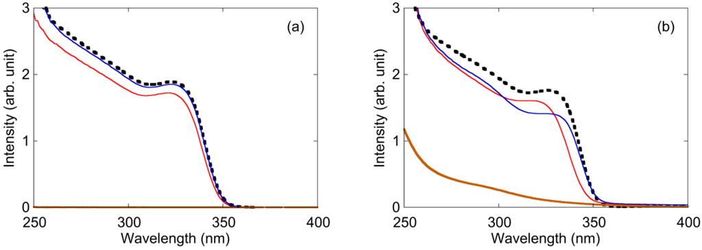 PL spectra of the ZnO nanoparticle solution with an excitation wavelength of 300 nm: (a) PEG was added to the solution; (b) PVP was added to the solution. Black dotted line: polymer was not added to the solution. Red solid line: polymer was added before the synthesis of ZnO nanoparticles. Blue solid line: polymer was added after the synthesis. Brown solid line: data of only the polymer solution.