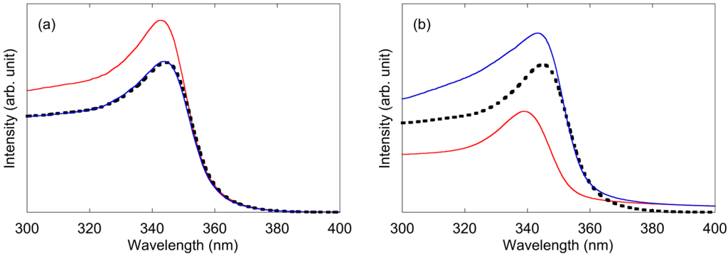 PLE spectra of ZnO nanoparticle solution with an emission wavelength of 500 nm: (a) PEG was added to the solution; (b) PVP was added to the solution. Black dotted line: polymer was not added to the solution. Red solid line: polymer was added before the synthesis of ZnO nanoparticles. Blue solid line: polymer was added after the synthesis of ZnO nanoparticles.