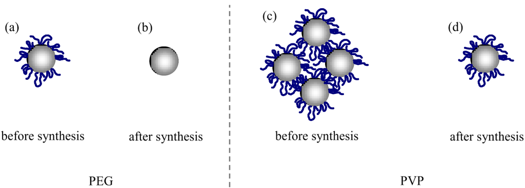 Schematic of ZnO nanoparticles capped by polymer molecules: (a) PEG was added to the ZnO solution before synthesis; (b) PEG was added to the ZnO solution after synthesis; (c) PVP was added to the ZnO solution before synthesis; (d) PVP was added to the ZnO solution after synthesis.