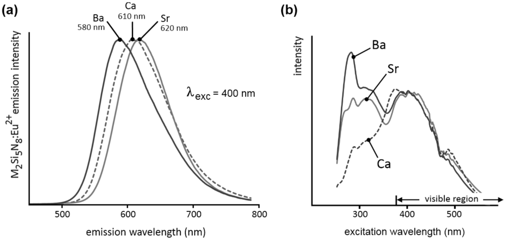 (a) Emission and (b) excitation spectra of M2Si5N8:Eu (M = Ca,Sr,Ba). The emission spectra were recorded for λexc = 400 nm. The excitation spectra were recorded for the emission at 610 nm for M = Ca, 620 nm for M = Sr and 580 nm for M = Ba.
