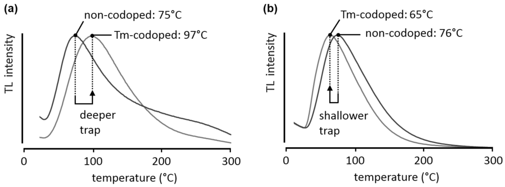 To illustrate that the same codopant can have different effects in different host crystals, the glow curves for Ba2Si5N8:Eu and Ba2Si5N8:Eu,Tm are shown in Figure 5b. In this case, the glow peak shifts to lower temperatures, in other words, the charge carrier trap becomes shallower (0.71 eV in the non-codoped case, 0.68 eV in the thulium-codoped sample, again assuming general order kinetics).