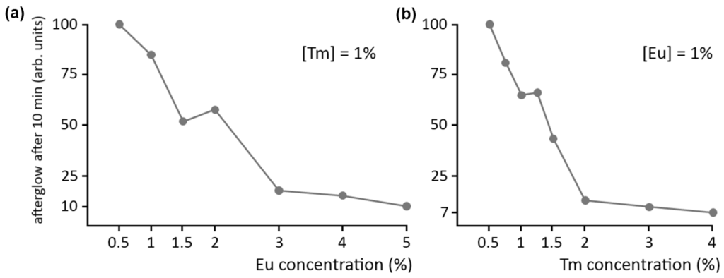 The afterglow brightness as a function of codopant concentration is shown in a similar fashion in Figure 6b, where the Eu concentration is kept constant at 1%. The effect is even more dramatic here: a Tm concentration of 2% reduces the afterglow intensity to 10% of the value at a concentration of 0.5%. Previous SEM and EDX investigations have revealed the formation of (non-luminescent) Tm-rich aggregates in the material when the concentration becomes too high [15]. This undesired phenomenon can be partially countered by increasing the preparation duration and temperature. Still, a Tm concentration above 1% is undesired for persistent luminescence in Ca2Si5N8:Eu,Tm.