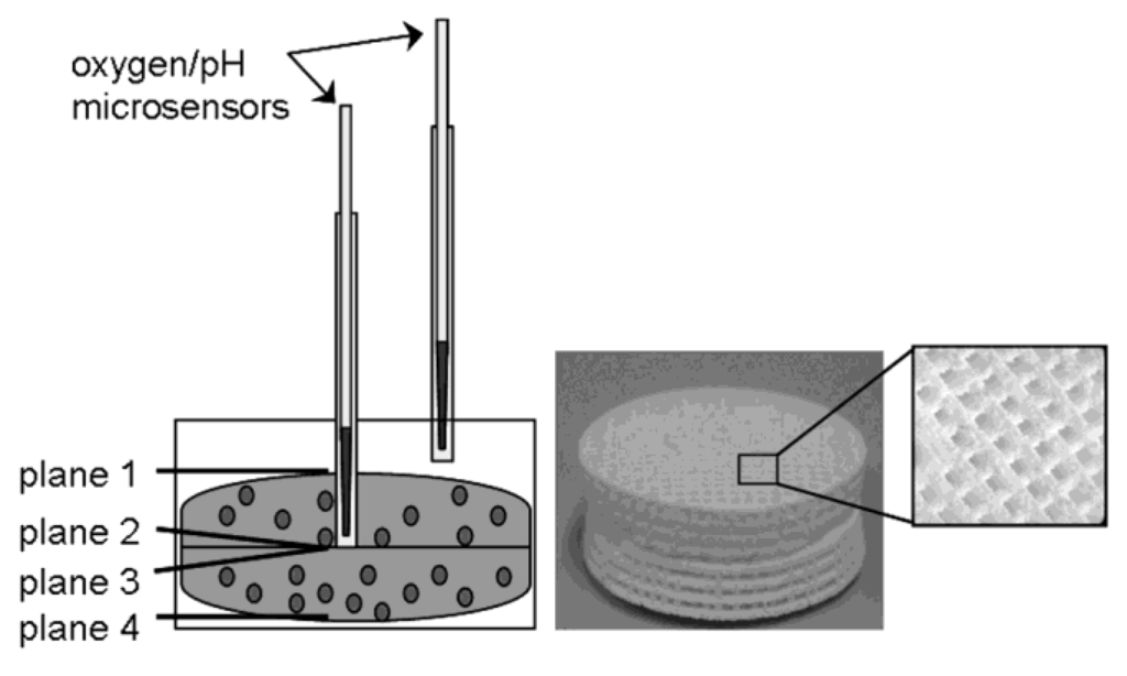 Human osteoblasts were seeded on porous cylindrical TCP scaffolds which were fabricated in a 3D printing process with loose powder and a polymer-based binder solution for local initial bonding of the powder. The CaP-based granulate TCP 4 was obtained from BioCer Entwicklungs-GmbH (Bayreuth, Germany). The printed ceramic green bodies were consolidated at a temperature of 1250 °C to improve their mechanical properties [12]. The disc-shaped TCP constructs were 30 × 5 mm in size with macropores of 700 × 700 µm in all three spatial directions. To distinguish between different depths, the complete scaffold module was composed of two TCP discs which were placed on top of each other (Figure 1). In addition, the upper TCP disc had a central hole to insert a standard hollow needle for oxygen and pH measurement (see 2.3. and 2.4.).