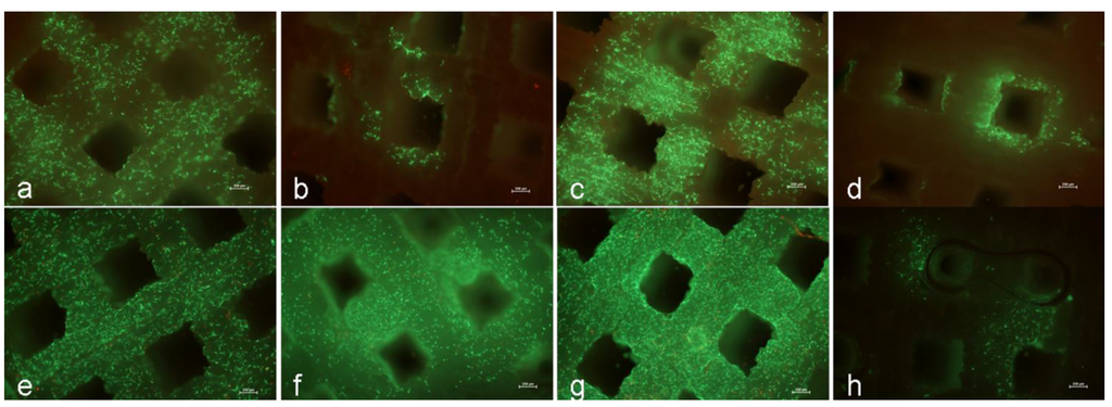 (a–h): Migration capacity and viability of human primary osteoblasts on the different planes of the 3D TCP scaffold on day one (a–d) and after eight days (e–h) of cultivation under static culture conditions (n ≥ 3; living cells = green, dead cells = red; bar: 250 µm); a, e: plane 1; b, f: plane 2; c, g: plane 3; d, h: plane 4.