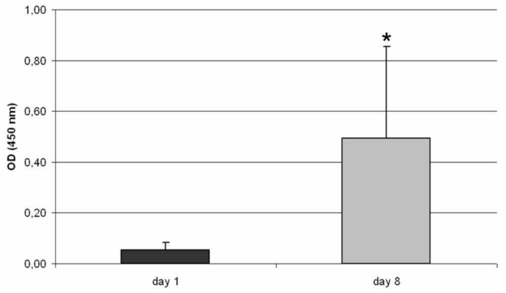Metabolic activity of human osteoblasts seeded on the 3D TCP scaffold after eight days of cultivation (n ≥ 3). Data are presented as mean value ± standard deviation. Statistical analysis was done with a Mann-Whitney-U-Test. Significance is based on the OD of day 1 (* p < 0.05).