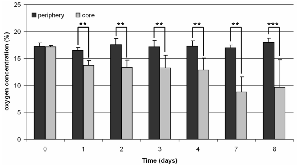 Oxygen concentration in a static 3D cell culture of human osteoblasts (n = 4). Measurement was done in the periphery as well as in the core of the TCP scaffold. Data are demonstrated as mean values ± standard deviation. Statistical analysis was done with ONEWAY ANOVA (Post hoc LSD). Significance is based on the respective oxygen concentration of the periphery (** p < 0.01; *** p < 0.001).