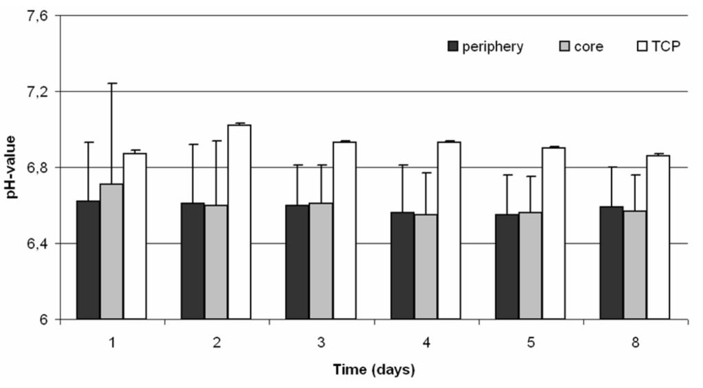 Furthermore, the acidification of the cell culture medium within and around the TCP scaffold was monitored. It is well described that hypoxia is associated with a local decrease of the pH value which is caused by an anaerobic cell metabolism [21]. In addition, small pH value reductions could influence the matrix deposition by osteoblasts negatively [21]. The results showed that there were no differences between the periphery and the core of the cell-seeded scaffold, although a difference in the pH value of approximately 0.3 between the cell-seeded and untreated scaffold was demonstrated. Nevertheless, the pH value of the untreated TCP scaffold was about 6.9, which demonstrates that TCP is a material with acidic characteristics.
