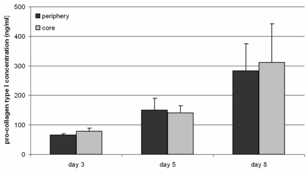 To gain information on the synthesis of ECM components, the medium of the core as well as the periphery was analyzed after 3, 5 and 8 days of cultivation. The synthesis rate of type I pro-collagen increased from 65 ng/mL to 283 ng/mL in the periphery and from 78 ng/mL to 311 ng/mL within the core over the period of time, but without a statistically significant difference between the periphery and the core (Figure 6).