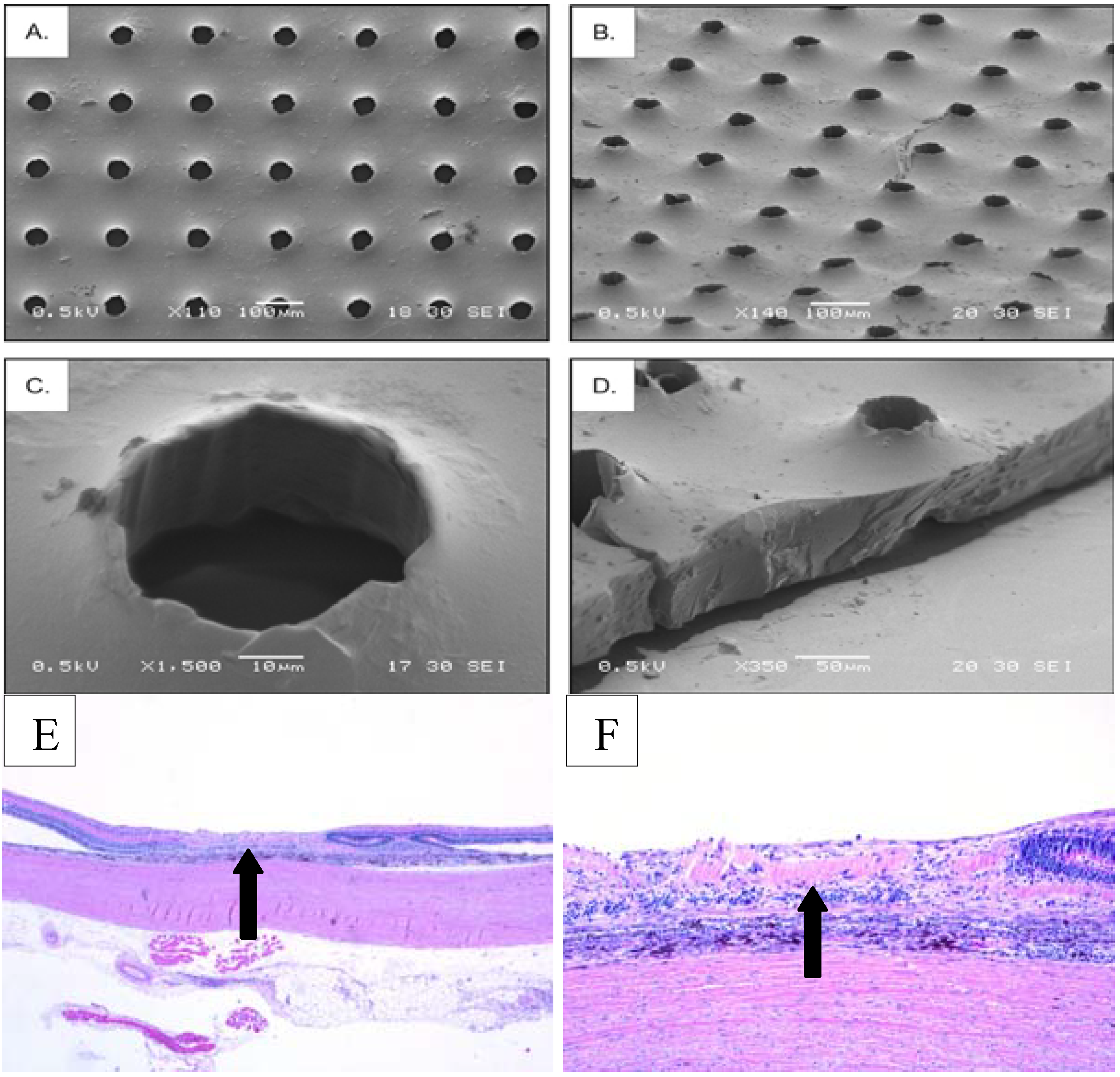 Porous PGS. Scanning electron micrographs, adapted from Neeley [46] depict a thinner polymer when compared to PLLA-PLGA. Further, the PGS polymer permitted surface modifications and scrollability. (A) and (B) show top views of the PGS polymer, while (C) and (D) display high magnification images of the polymer’s pores and edges, respectively. Despite improved fabrication techniques, the lower panel arrows depict the position of the polymer in the subretinal space (E) and the complete loss of the retinal layers 30 days post transplantation (F).