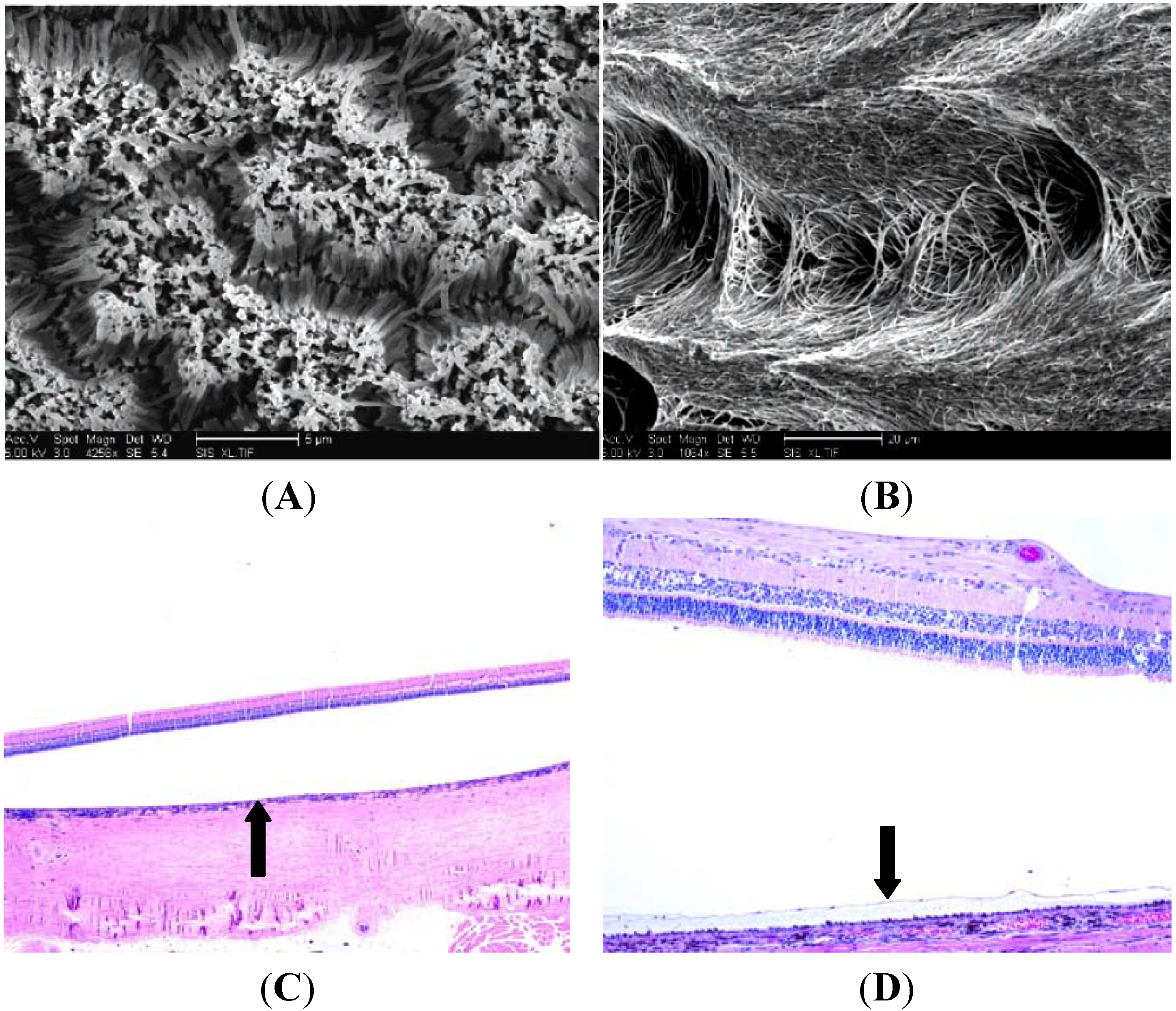 PCL with Incorporated Nanowire. Scanning electron micrographs show the PCL polymers with short (A) and long (B) incorporated nanowires [47]. This PCL polymer is the thinnest polymer to be used in retinal tissue engineering to date. In both the histologic images (C,D), the detachment of the neural retina from the RPE is an artifactual byproduct of the fixation process. The arrow on the left panel indicates the position on the polymer in the subretinal space. The inverted arrow on the right panel is demonstrating an example of a healthy retinal pigment epithelium, which further indicates the innocuous nature of the PCL polymer.