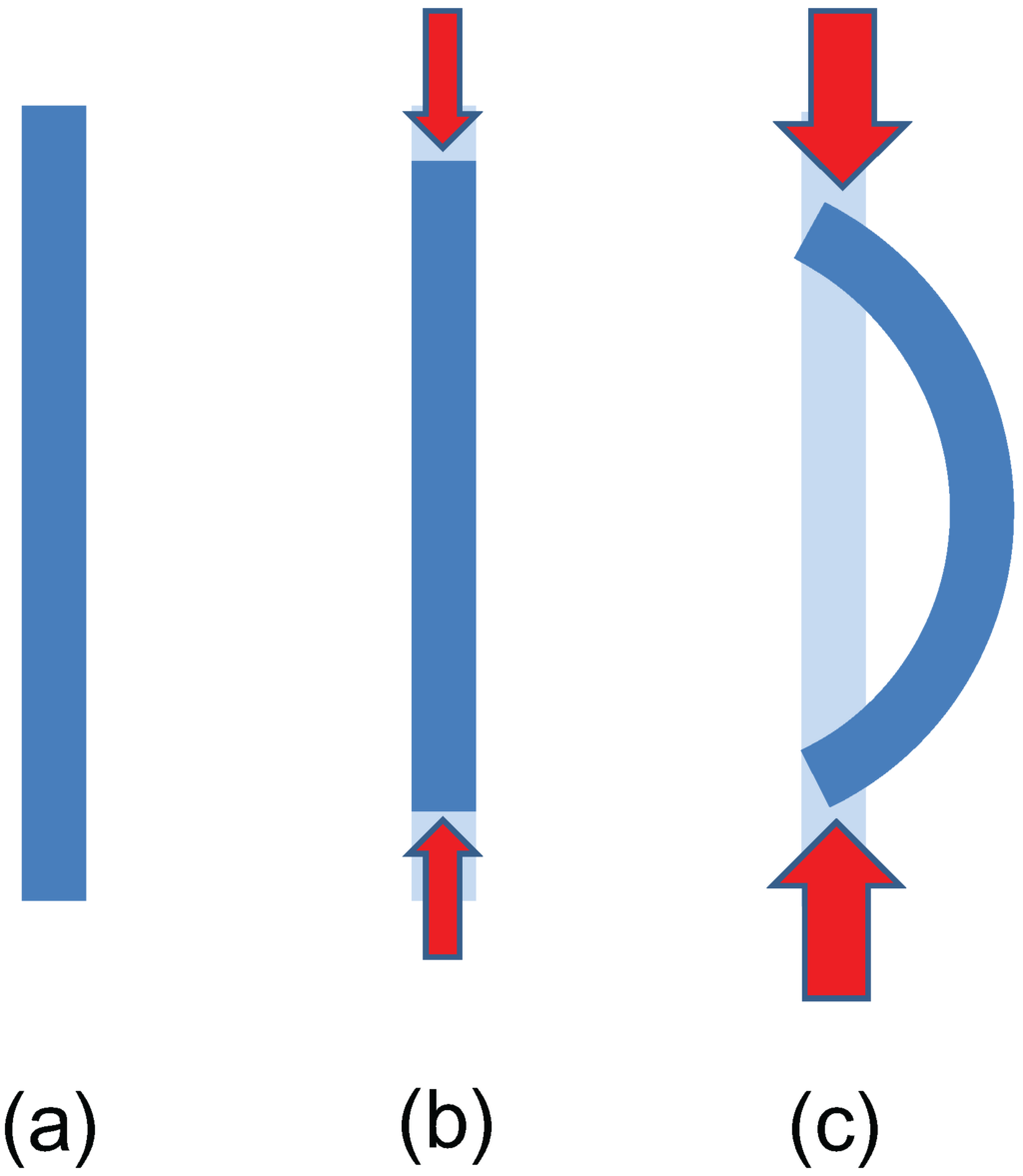 Schematic diagram of buckling of an elastic beam under axial compression: (a) pristine beam; (b) axial compression for a small load; (c) buckling observed beyond a critical load.