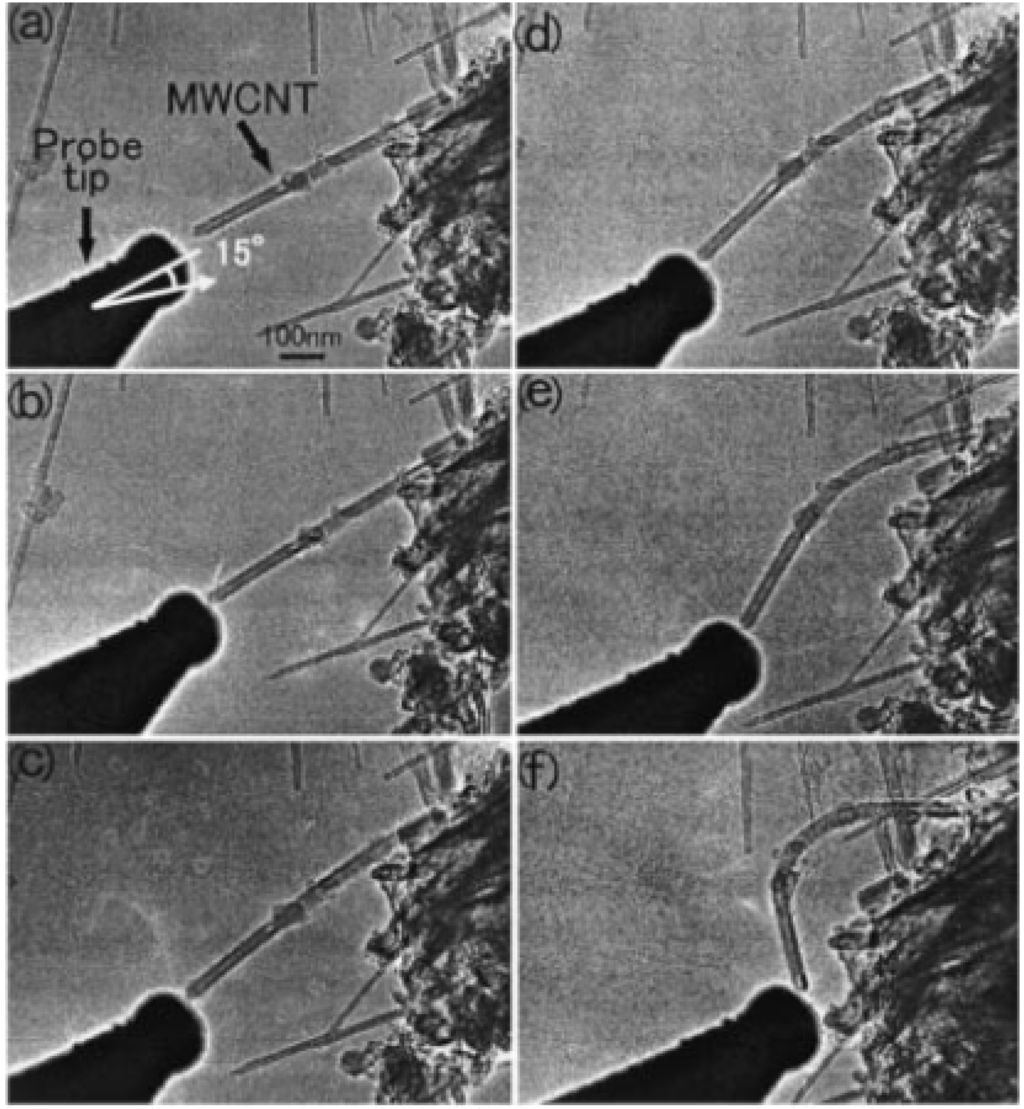 (a)–(f) Series of TEM images of deformation processes for MWNTs initiated by applying compressive force in the sample direction; (g) Force–displacement diagram. The points indicated by arrows correspond to the TEM images in (d) and (e). Reprinted from Reference [].