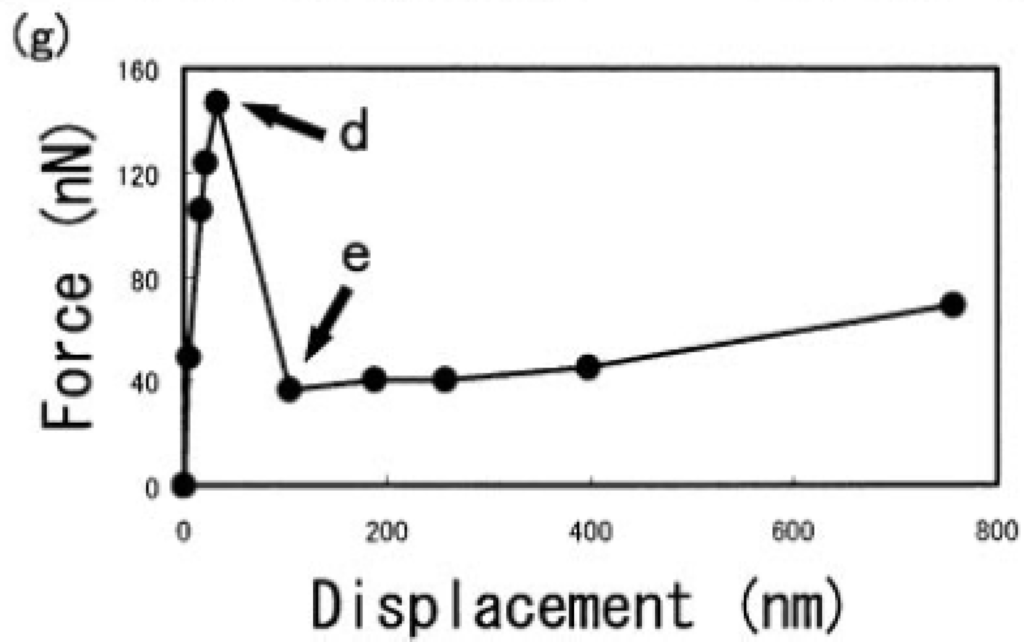 The pioneering work [] is presented in Figure 2; The TEM images of (a)–(f) clarify a series of deformation processes for multiwalled nanotubes (MWNTs) initiated by applying a compressive force in the nearly axial direction []. Figure 2(g) shows the corresponding force–displacement diagram. The force at the initial stage is almost proportional to the displacement [left to the point (d)], indicating the elastic region, followed by an abrupt decrease at (e). The two points indicated in Figure 2(g) correspond to the TEM images in panels (d) and (e), respectively. In Figure 2(g), the curve right to the point (e) maintains a slightly upward slope. The reason for this post-buckling strength may be due to sequential emergence of different buckling patterns with increasing the displacement.