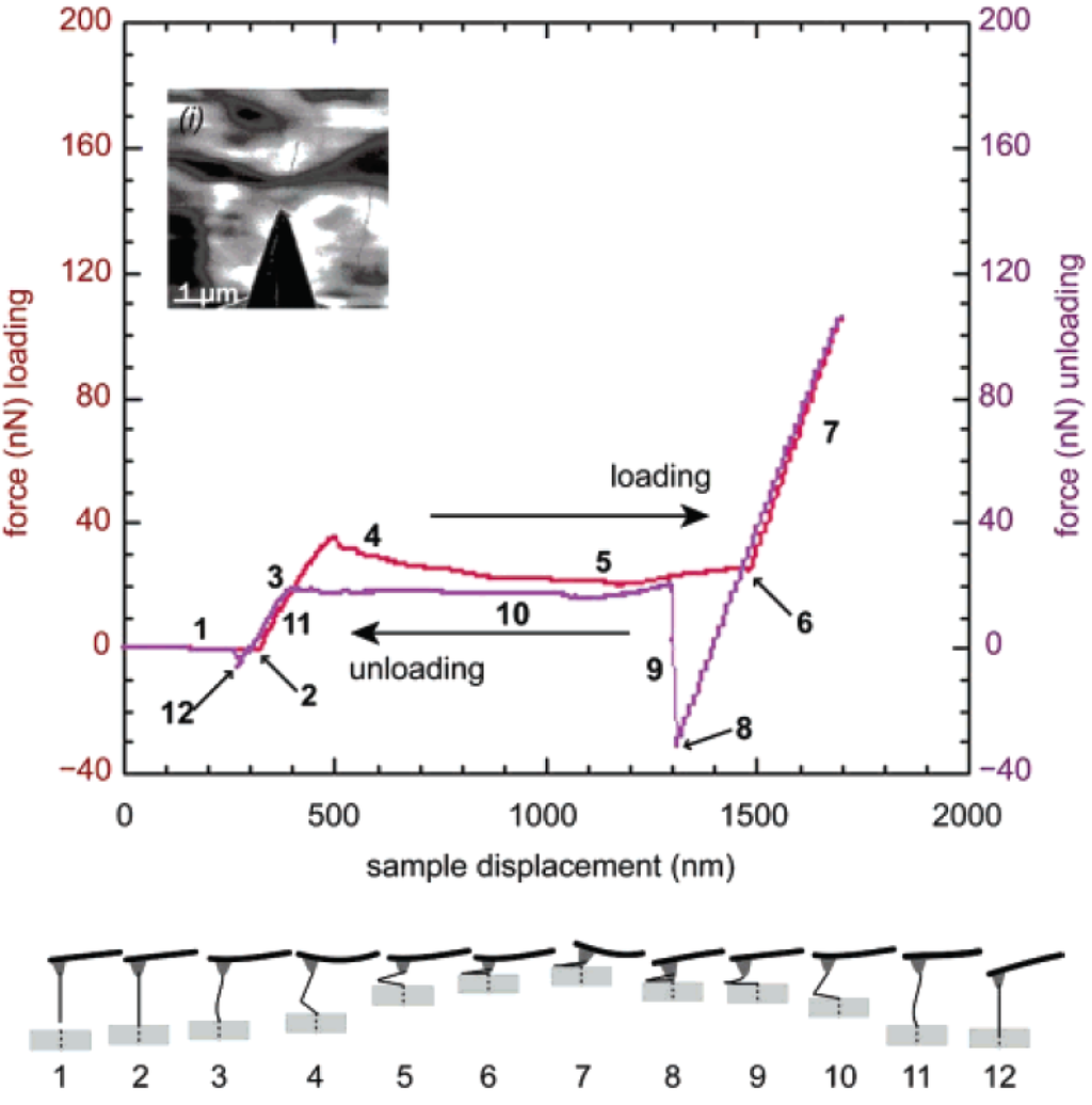 - The instability at (8) and the sharp rise at (9) during unloading stem from the tip pulled out of contact from the sample, while the nanotube end remains in contact.