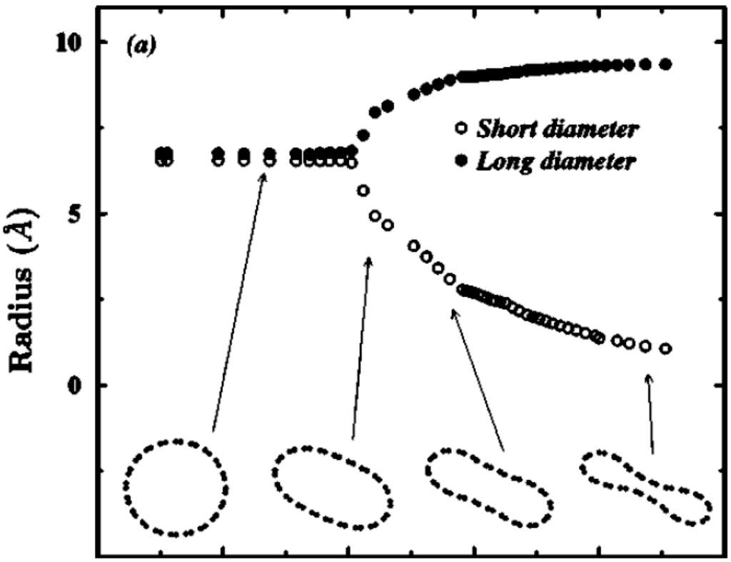 Long and short diameters of a (10,10) SWNT as a function of applied hydrostatic pressure. The shape of the cross section at some selected pressures is plotted at the bottom of the figure. Reprinted from Reference [].