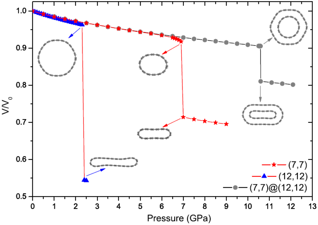 The overall scenario of SWNT deformation under hydrostatic pressure is summarized in Figure 5 []. With increasing pressure, cross sections of SWNTs deform continuously from circular to elliptical, and finally to peanut-like configurations [,,,]. The radial deformation of carbon nanotubes strongly affects their physical and structural properties. For instance, it may cause semiconductor-metal transition [,], optical response change [], and magnetic moment quenching [] in nanotubes. From a structural perspective, the radial collapse can give rise to interwall sp bonding between adjacent concentric walls [,], which may increase nanotube stiffness and therefore be effective for high-strength reinforced composites [,,,].