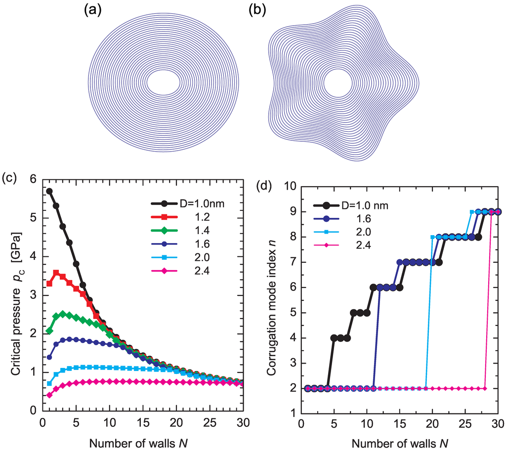 Figure 7(a,b) illustrates MWNT cross-sectional views of two typical deformation modes: (a) elliptic ; and (b) corrugation modes. In the elliptic mode, all constituent walls are radially deformed. In contrast, in the corrugation mode, outside walls exhibit significant deformation, whereas the innermost wall maintains its circular shape. Which mode will be obtained under pressure depends on the number of walls, and the core tube diameter D of the MWNT considered. In principle, larger N and smaller D favor a corrugation mode with larger n.