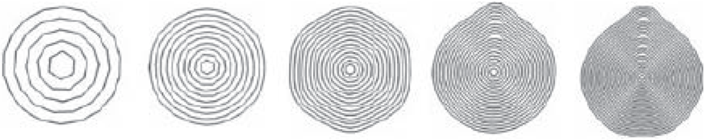 Other types of radial deformation arise when deviate the interwall spacings of MWNTs from the vdW equilibrium distance (∼0.34 nm) [,,,]. The simulations show that the cross sections stabilized at polygonal or water-drop-like shapes, depending on the artificially expanded interwall spacings []. Figure 8 depicts the cross-sectional configurations of relaxed MWNTs. It is seen that the 15-walled tube is stabilized at a polygonal cross-sectional configuration with six rounded corners. For the 20- and 25-walled ones, the configuration becomes asymmetric, featuring a water-drop-like morphology.