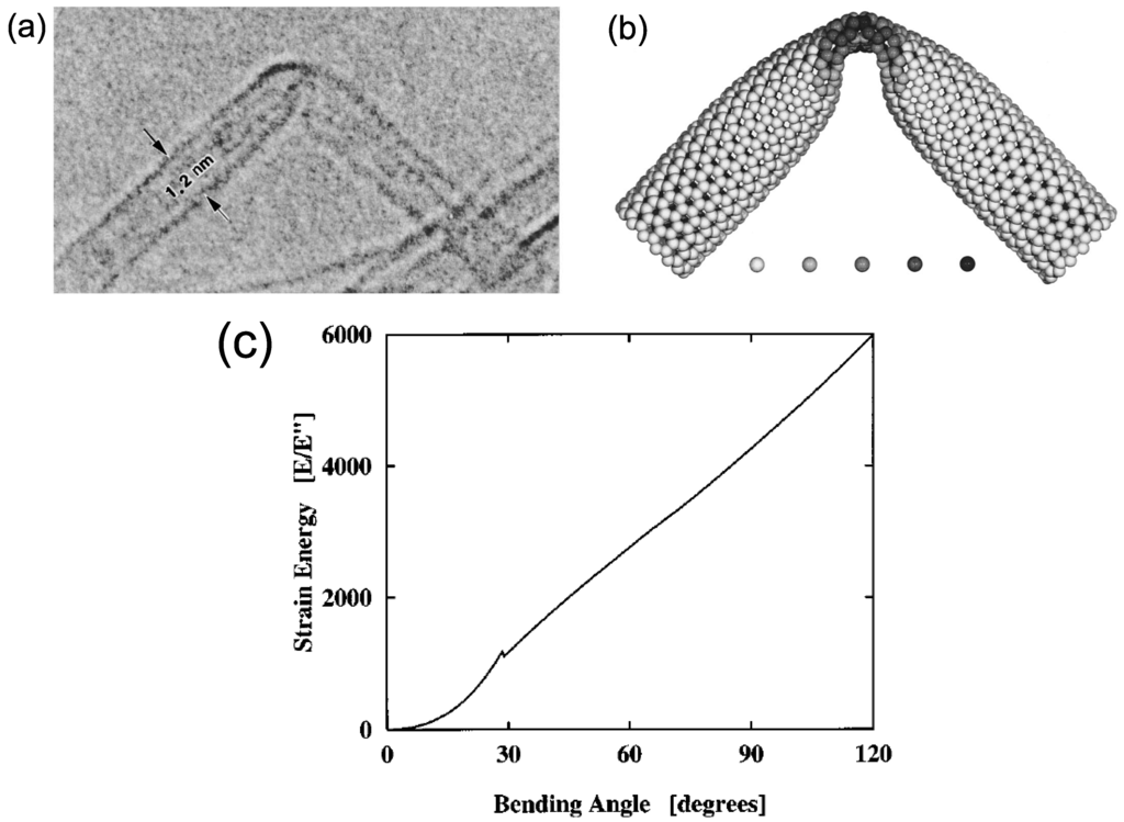The buckling of SWNTs under bending was pioneered in 1996 [] using high-resolution electron microscopes and molecular-dynamics (MD) simulation. Figure 9(a) shows a TEM image of a bent SWNT with a diameter of 1.2 nm []. By bending an initially straight SWNT, its outer and inner sides undergo stretching and compression, respectively. As a result, it develops a single kink in the middle, through which the strain energy on the compressed sides is released. Upon removal of the bending moment, it returns to the initial cylindrical form completely without bond breaking or defects. This observation clearly proves that SWNTs possess extraordinary structural elastic flexibility.