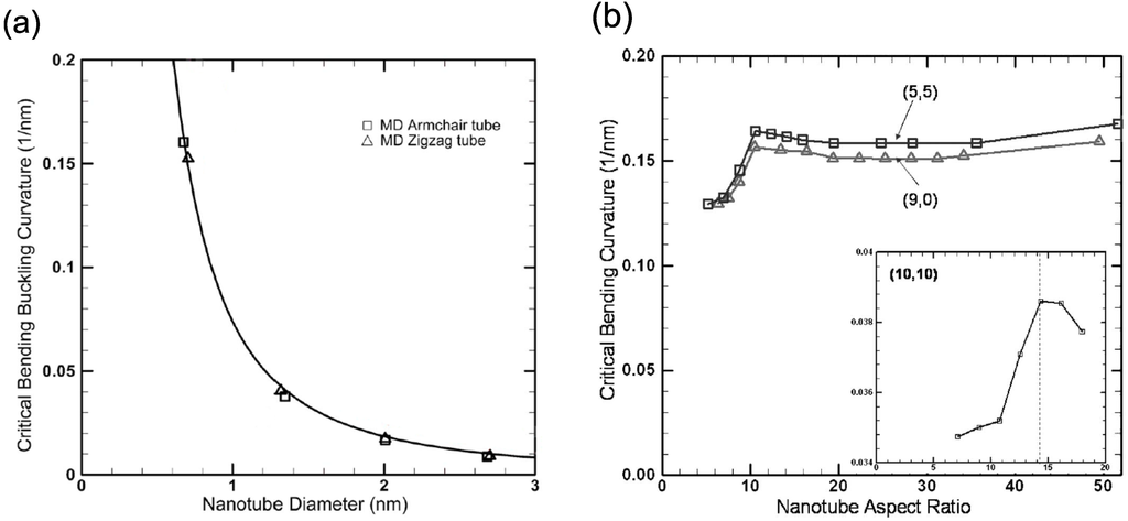 (a) Relationship between critical bending buckling curvature and nanotube diameter d obtained from MD analyses. The tube length is fixed at 24 nm; (b) The length/diameter aspect ratio dependence of for the tube chiralities of (5,5), (9,0), and (10,10). Reprinted from Reference [].