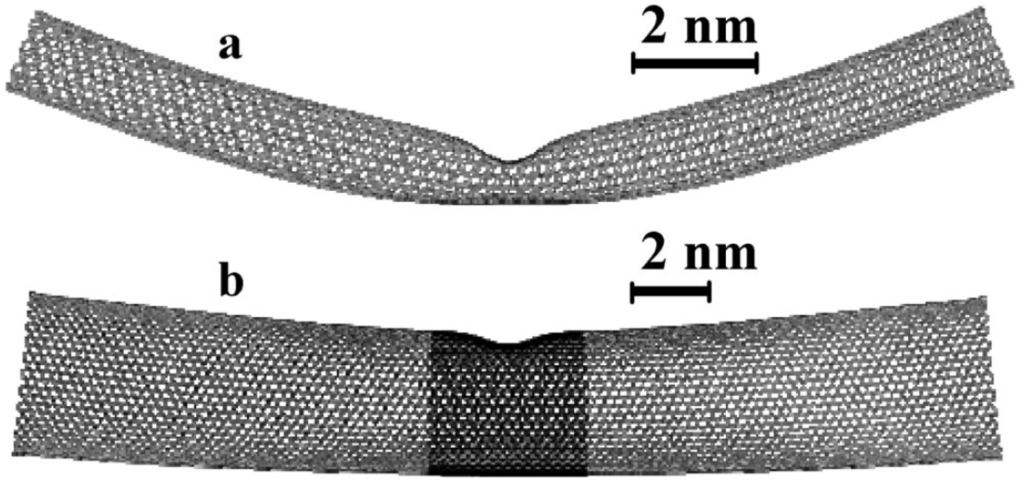 We have learned in Section 4 that for relatively thin SWNTs, the buckling is characterized by a discontinuity in the energy curve [Figure 9(c)]. Across the buckling point, the bending angle dependence of the deformation energy changes suddenly from being quadratic in the prebuckling regime to linear in the postbuckling regime. This is, however, not the case for larger diameter nanotubes. As the diameter is increased, a second discontinuity appears in the strain-energy curve at a larger bending angle than the first one []. The origin of the two discontinuities can be accounted for by inspection of Figure 11. The bottom image [Figure 11(b)] shows a just-buckled wall of a (30, 30) SWNT corresponding to the first discontinuity in the energy curve, in which the buckled side is far from the opposite side. Therefore, more bending is required to bring the two sides close enough, as observed in Figure 11(a), which results in the second discontinuity.