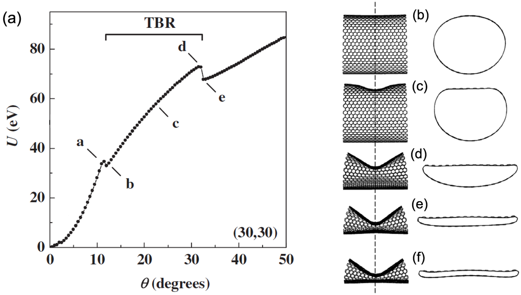 (a) Deformation energy U for a 23.6-nm-long (30,30) SWNT as a function of the bending angle θ. The symbols a–e attached to the curve indicate the points for which the tube shape and cross section at the buckling point are shown in the images (b)–(f) on the right. “TBR" denotes the transient bending regime. Reprinted from Reference [].