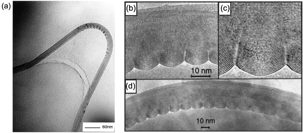 Figure 13(a) presents a clear example of the rippled MWNT structure []. The tube diameter is ∼31 nm and it is subjected to a radius of bending curvature of ∼400 nm. Enhanced images at the ripple region [] are also displayed in Figure 13(b–d), though they are not identical to the specimen in Figure 13(a). The amplitude of the ripple increased gradually from inner to outer walls, being essentially zero for the innermost core tube to about 2 to 3 nm for the outermost wall. Such rippling deformation induces a significant reduction in the bending modulus, as has been explained theoretically by solving nonlinear differential equations [].