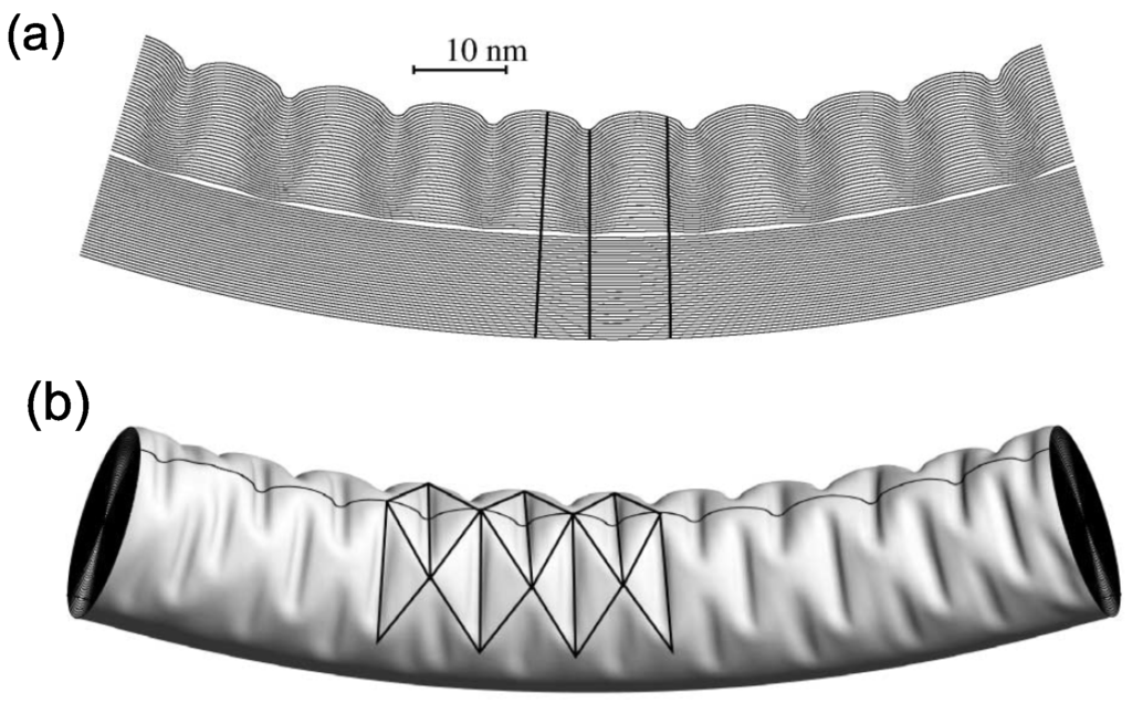 Precise information about the membrane profile and the energetics of the rippling deformation, which are unavailable in experiments, can be extracted from large-scale computer simulations. Figure 14(a) shows a longitudinal cross section of the equilibrium configuration []. This image is the computational analog of the TEM slices of rippled, thick nanotubes reported in the literature [,]. The simulations reproduce very well the general features of the observed rippled nanotubes: nearly periodic wavelike distortions, whose amplitudes vanish for the inner tubes and smoothly increase toward the outer layer.