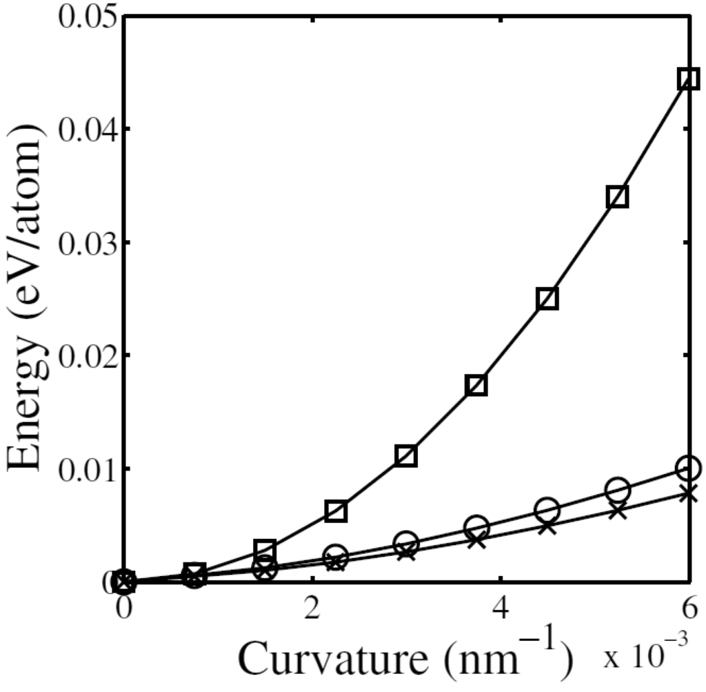 Energy curves for a bent 34-walled nanotube with respect to the bending curvature. Shown are the strain energy for fictitiously uniform bending (squares), the strain energy for actually rippled deformation (crosses), and the total energy (i.e., sum of the strain energy and the vdW one) for rippled deformation (circles). Reprinted from Reference [].