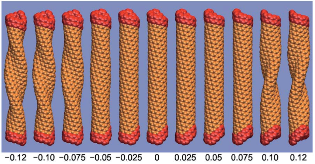 Morphological changes for a nanotube under torsion. Applied strain and its direction are indicated beneath the diagram; the digit 0.05, for example, corresponds to the strain of 5%, and the sign + (−) indicates right(left)-handed rotation. Under right-handed rotation, the tube buckles at a critical buckling strain = 7.6%, whereas it buckles at under left-handed rotation. Reprinted from Reference [].