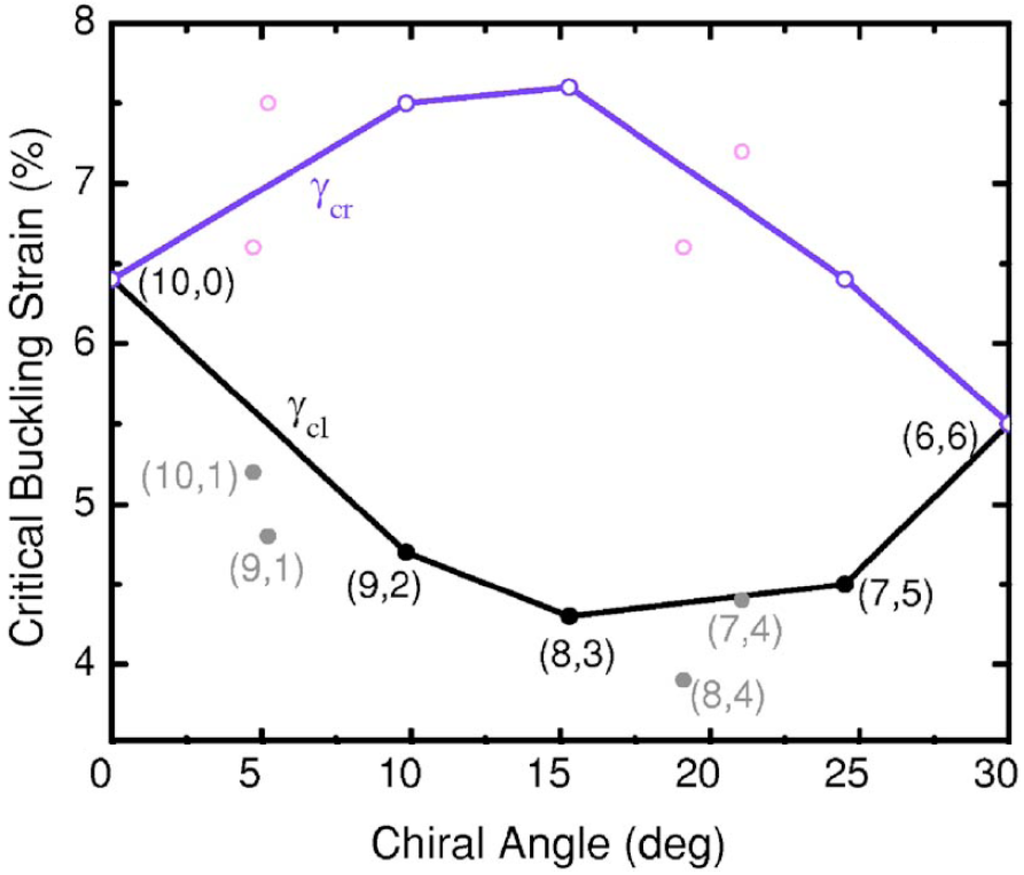 Critical buckling shear strains as a function of tube chirality. Some additional data for SWNTs with slightly larger or smaller diameters are also presented for reference. Reprinted from Reference [].