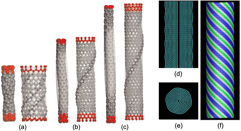 (a)–(c) Helical buckling of (5,0)@(14,0) DWNTs with lengths: (a) 1.095 nm; (b) 4.45 nm; and (c) 6.97 nm. For each tube length, the inner wall shows ordinary buckled patterns, whereas the outer wall exhibits nontrivial buckling modes associated with local rims; (d)–(f) Helical rippling deformation of a 10-walled nanotube (5,5)@⋯@(50,50) of 34 nm in length and 3.4 nm in radius: (d) Longitudinal view; (e) Cross-sectional view; (f) Deformation map, with green for ridges and blue for furrows. Reprinted from References [,].