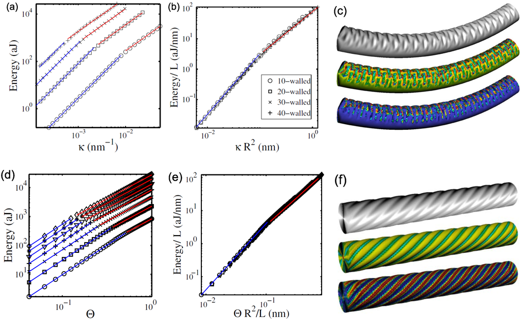 Interestingly, buckled MWNTs under bending and torsion were found to obey universal scaling laws that consist of two distinct power-law regimes in the energy-deflection relation []. Figure 19 shows the mechanical response of MWNTs under bending and torsion; the strain energy E vs. bending curvature κ or twisting angle Θ is plotted with the increasing stepwise number of walls from 10 to 40. All the tested MWNTs exhibit two distinct power-law regimes: a harmonic deformation regime characterized by the exponent for the relation or (indicated by blue lines in Figure 19) and an anharmonic, postbuckling regime with exponent for bending and for torsion (red lines). The latter nonlinear response corresponds to the ripples of the graphene walls discussed earlier.
