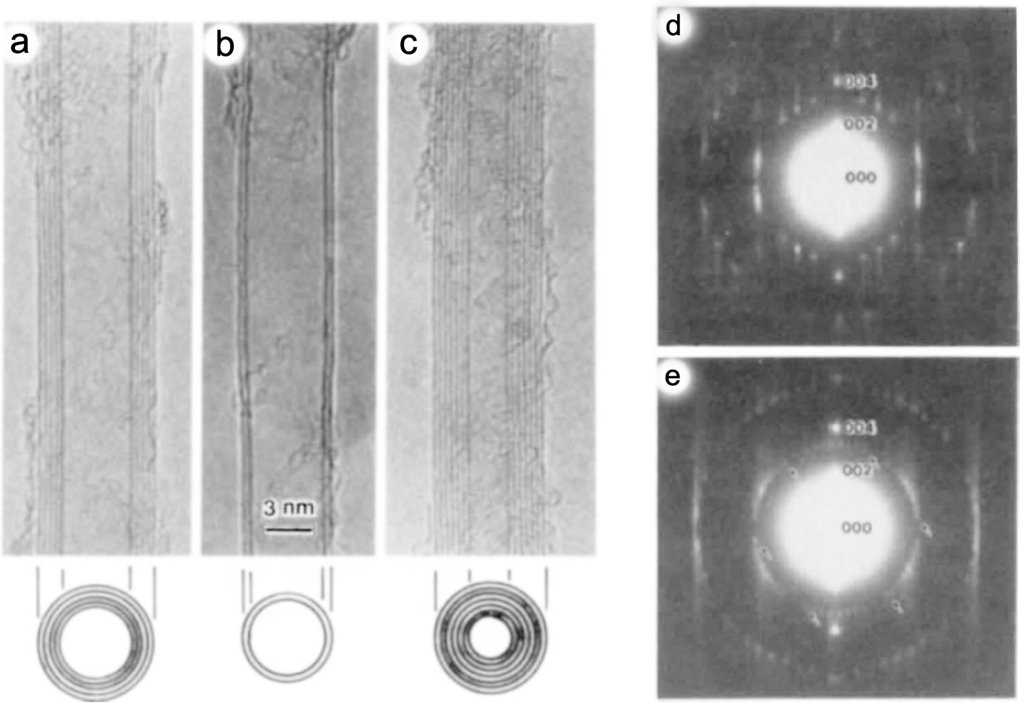 - Despite the omission of a scale bar, the magnification value indicated in the article allows one to estimate that the diameters of the carbon tubes imaged are in the range of 50 nm, i.e., definitely nanosized.