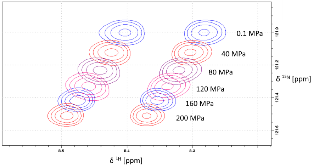 High pressure nuclear magnetic resonance spectroscopy (HP-NMR) is a powerful tool for investigating thermodynamic behavior of macromolecules in solution at atomic resolution (for a review see e.g., [1]). Application of pressure has direct effects on molecular properties such as bond lengths in hydrogen bonds but more importantly usually shifts conformational equilibria in the structural ensemble of biological macromolecules such as proteins by its contribution to the free energies of the system. These structural changes influence all NMR parameters but notably chemical shifts are very precisely observable. Since proteins have a highly anisotropic compressibility the observed chemical shift changes show large variations from atom to atom. In rigid proteins such as the basic pancreatic trypsin inhibitor (BPTI), the pressure-induced changes of chemical shifts can be fitted well by a linear dependence for almost all atoms [2]. In contrast, in proteins that exist in more than one conformational state in solution, usually non-linear pressure responses are found. The first example was the histidine containing protein (HPr) from S. carnosus that shows strong deviations from the linearity in the pressure response. Usually, these shifts are observed in regions of the protein where interactions with small ligands or other proteins occur. In HPr it is the active-centre loop around His15 (interaction site with enzyme I and enzyme II) and in the regulatory helix B (interaction site with the HPr-kinase/phosphatase) [3]. These regions should also show a higher internal mobility [4] and compressibility since structural transitions should be possible.