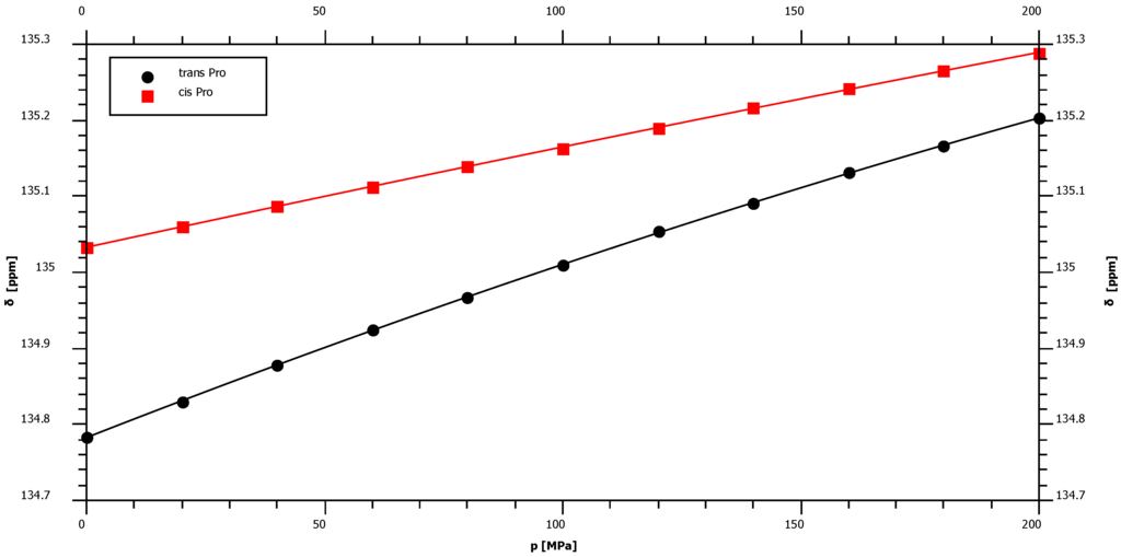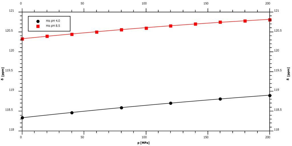 Data processing, spectral analysis and peak picking was performed with BRUKER Topspin 2.1. The pressure dependence of chemical shift δ was fitted to Equation (3) with QtiPlot 0.9.8 using a Scaled Levenberg-Marquardt algorithm.