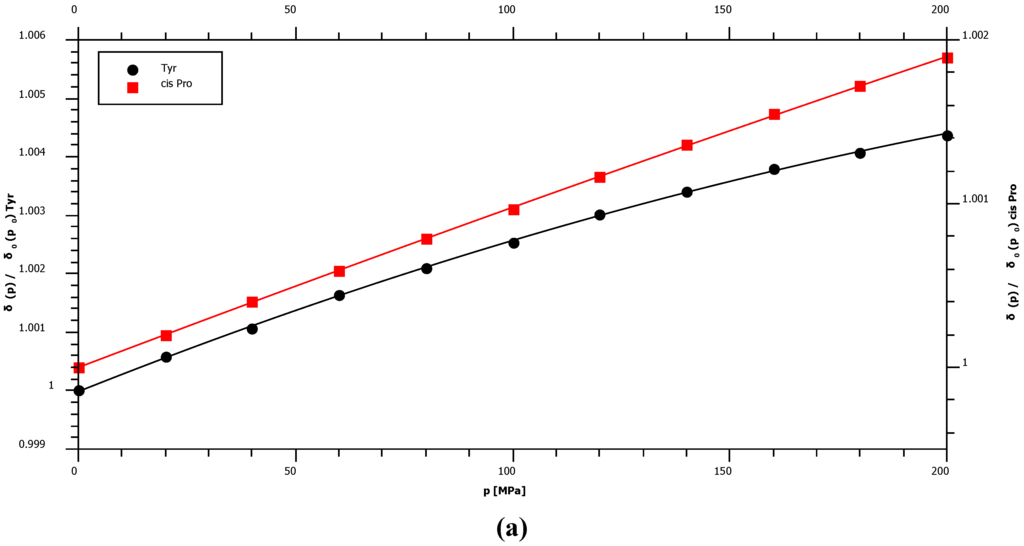 with p'i the population of state i, Z the states sum, Gi0 the free energy at (p0, T0), Vi0 the partial molar volume at (p0, T0), βi0 the compressibility factor at (p0, T0) and R the gas constant. For the interpretation of the data it is important to separate trivial chemical shift changes as they occur also in unfolded peptides from structurally or functionally important pressure induced changes. The simplest way to do such a correction is just subtracting the relatively small pressure dependent chemical shifts of model peptides from the experimental data. The small pressure dependent changes of the chemical shift δ (T, p) can be fitted sufficiently well by a second order Taylor expansion as