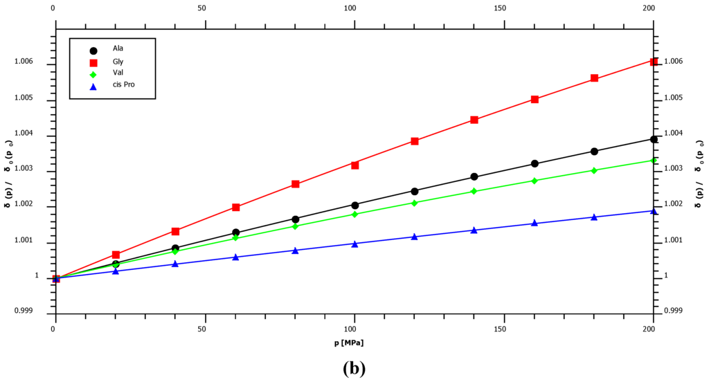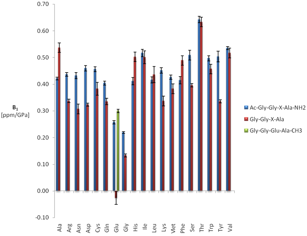 The average first and second order shift coefficients <B11H> and <B21H> are 0.52 ppm/GPa and −0.41 ppm/GPa2 in Ac-Gly-Gly-X-Ala-NH2. In Gly-Gly-X-Ala they are with 0.42 ppm/GPa and −0.18 ppm/GPa2 somewhat smaller. The first order pressure coefficients are positive in both peptides, that is a downfield shift of the 1H amide resonances with pressure is observed. The only exception described by Arnold et al. [5] is glutamate where a negative first order pressure coefficient and a large second order coefficient had been observed. However, these unusual pressure coefficients are due to an interaction with the negative charge of the C-terminal carboxyl group since its methylation [10] or amination leads to a “normal” behavior of the amide resonance (Figure 5).