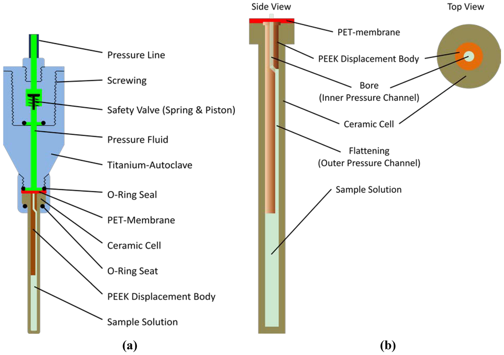 High pressure autoclave. (a) The high pressure autoclave holding the ceramic cell is similar to that provided by Daedalus Corporation [14], but has additionally a safety valve analogous to that described earlier by Beck Erlach et al. [15]; (b) A PET membrane was posed on top of the ceramic cell, and a bored and flattened cylindrical displacement body was inserted into the tube.