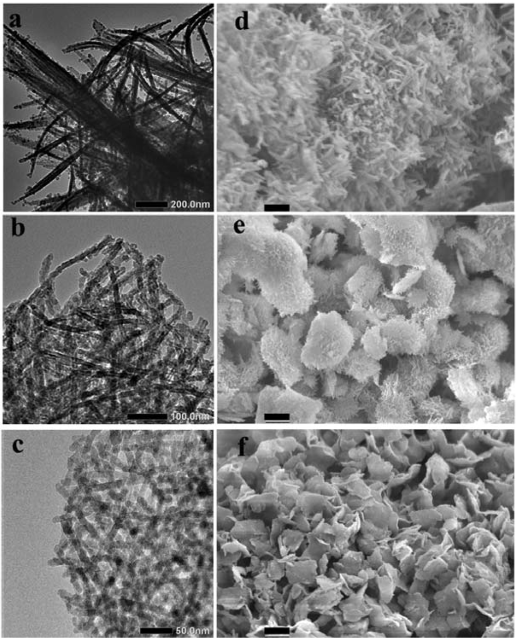 Our first interest here is screening whether the crystalline LPEI aggregates generated by the differently accelerated cooling processes afford the specially structured silica after mixing the LPEI aggregates with MS-51 (methyl silicate-51, a commercially available silica source with 5-mer tetramethoxysilane). Therefore, we subjected the silica powders obtained from Process-I, -II and -III to TEM and SEM observation. Interestingly, as seen in the in Figure 1, the products of LPEI@SiO2 via different cooling processes showed different morphologies and sizes. In the case of Process-I, the produced LPEI@SiO2 appeared larger bundles in which a lot of one-dimensional nano structures (ribbon-like fibrils) coalesced each other. This is likely the case of natural cooling hot LPEI solution to room temperature in our previous reports [15]. Under the dramatically accelerated cooling conditions, however, the produced LPEI@SiO2 turned into the forms of nanotube-based platelets (in Process-II) and nanowires-based platelets (in Process-III). The size of the platelets in Process-II ranged from 5 to 10 µm but became small, below 5 µm, in Process-III. Interestingly, a lot of nanotubes with approximately 20 nm in diameter or nanowires approximately 10 nm in diameter knitted closely and densely each other forming platelets in which the nanotubes or nanowires grew nearly straightly towards the edge of platelets without embedding the ends in the platelets body. The nanotubes are approximately 3 nm hollow inside. In contrast, the silica mediated by the process-IV showed irregular fibrils-based bundles in which the fibrils are likely assemblies of irregular nanoparticles with an average size of 15 nm, i.e., necklace-like structure (see Figure S1 in the Supporting Information). Therefore, it is conclusive that the morphologies and the fine structures of the 1D LPEI@SiO2 hybrids are easily controllable through different cooling processes.