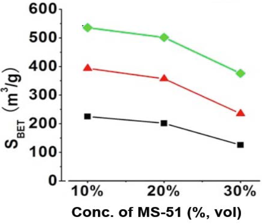 We calcined the LPEI@SiO2 hybrids at 800 °C and subjected the remained silica powders to N2 adsorption-desorption measurement to understand the characteristics in surface area and pore size distributions. It was found that the typical N2 adsorption-desorption isotherms for the calcined silica showed characteristic hysteresis loops as seen in porous materials and the pore size distribution ranged between approximately 5–30 nm (Figure S3). Such mesoporosity would be caused by the hollow structure of silica nanotube and the intergrain voids, which are constructed in the platelet piled up by a lot of 1D-structured nanosilica. It was found that the mesoporosity became smaller for the silica that was prepared under high concentrations of MS-51. Practically, the BET surface areas (SBET) largely related with the concentrations of LPEI (wt %) and MS-51 (vol %), which can be clarified in Figure 2. It is apparent that the values of SBET for the silica elevated with increasing LPEI concentrations while declined with increasing MS-51 concentrations (Figure 2). Herein, the values of SBET can be divided into three ranges based on LPEI concentrations: 100–200 m2/g for LPEI being 2.0%, 250–350 m2/g for 5.0% and 350–500 m2/g for 10% (in weight). Obviously, the higher concentration of LPEI was used, the larger surface area of silica was produced. This means that the LPEI enclosed in silica can play as a pore-directing agent; the more LPEI the more pores. On the other hand, SBET decreased about 100 m2/g when concentration of MS-51 changed from 10% to 30% (in vol %), indicating that the relatively less amount of MS-51 are favorable to increase surface area of the silica. This is consistent with the increment of mesoporosity under lower concentration of MS-51. We confirmed that the SiO2 calcined at 800 °C, did not show morphological damage.