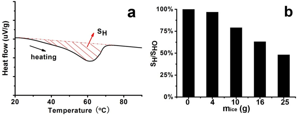 Differential scanning calorimetry (DSC) curve and integrated heat of fusion (SH) of samples under different cooling processes (different mice) by fixing 5% LPEI. (a) Typical DSC curve; (b) Plot of ratios of SH/SHO against mice.