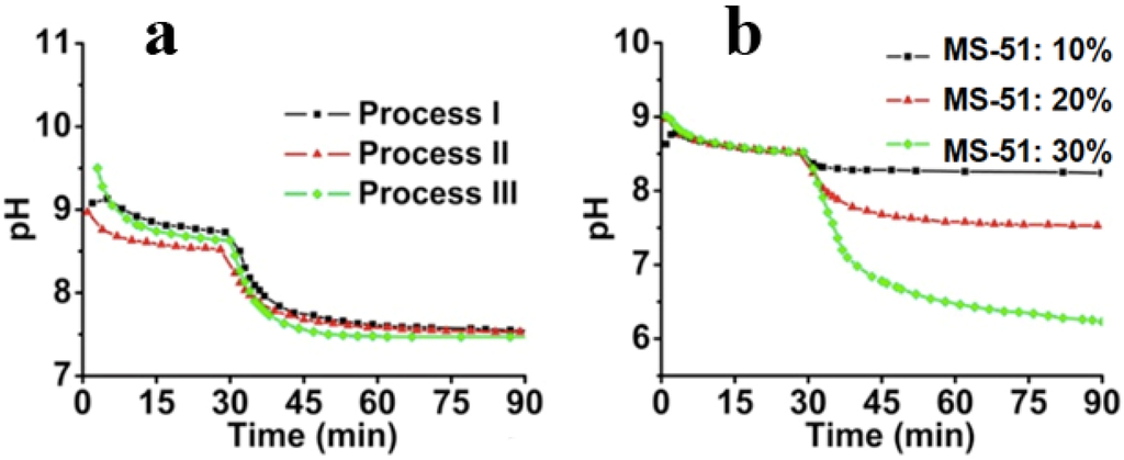 Time-course of pH change. (a) pH change curves under different cooling processes (different mice) by fixing 5 wt % LPEI and 10 vol % MS-51; (b) pH change curves under different concentrations of MS-51 by fixing 10 wt % LPEI in Process-II (mice = 10 g).