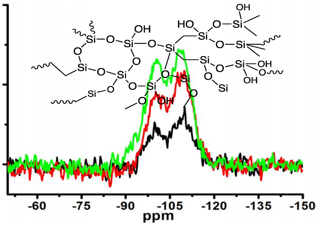 29Si CPMAS NMR spectra of the samples under different concentrations of MS-51 by fixing 10 wt % LPEI in Process-II (mice = 10 g). Insert: schematic description of amorphous silica. Black line: 10 vol % MS-51; Red line: 20 vol % MS-51; Green line: 30 vol % MS-51.