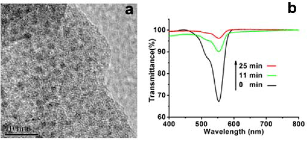 It is known that LPEI can act as a reducing agent and therefore the as-prepared LPEI@SiO2 can play both as reducing agent and host [19]. As an application, the LPEI@SiO2 hybrids obtained under the conditions of (Process-III, mice = 25 g, 5 wt % LPEI and 30 vol % MS-51) were employed to load Pt nanoparticles as catalyst. Here, just simply mixing PtCl42− solutions with LPEI@SiO2 powders, we loaded the Pt nanoparticles on the silica. As shown in Figure 6a, the HRTEM shows that Pt homogeneously distributed around the silica. The XRD pattern also shows the characteristic peaks of Pt (Figure S5). Since metallic nanoparticles can be used as catalysts in the organic reactions [27,28,29,30], we used the Pt-loaded SiO2 as a catalyst in the reduction of Rhodamine B by DMAB. As shown in Figure 6b, after mixing the catalyst of Pt-loaded SiO2 with the solution of containing RhB and DMAB, the absorption at around 553 nm of RhB decreased dramatically with almost de-colored state only within 11 min. In contrast, the solution without addition of the Pt-loaded SiO2 showed little color change even after 24 h. This contrast indicates that the Pt-loaded SiO2 is an active catalyst for the reduction of RhB by DMAB. As for the catalytic mechanism, the Pt nanoparticles loaded on silica wire can play as electron pool where the electrons from DMAB are trapped on Pt and then passed to RhB.