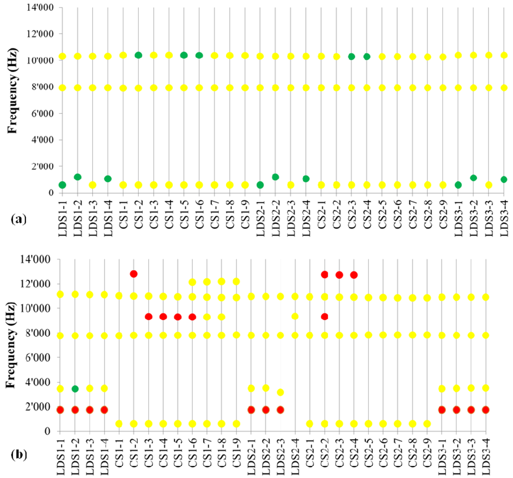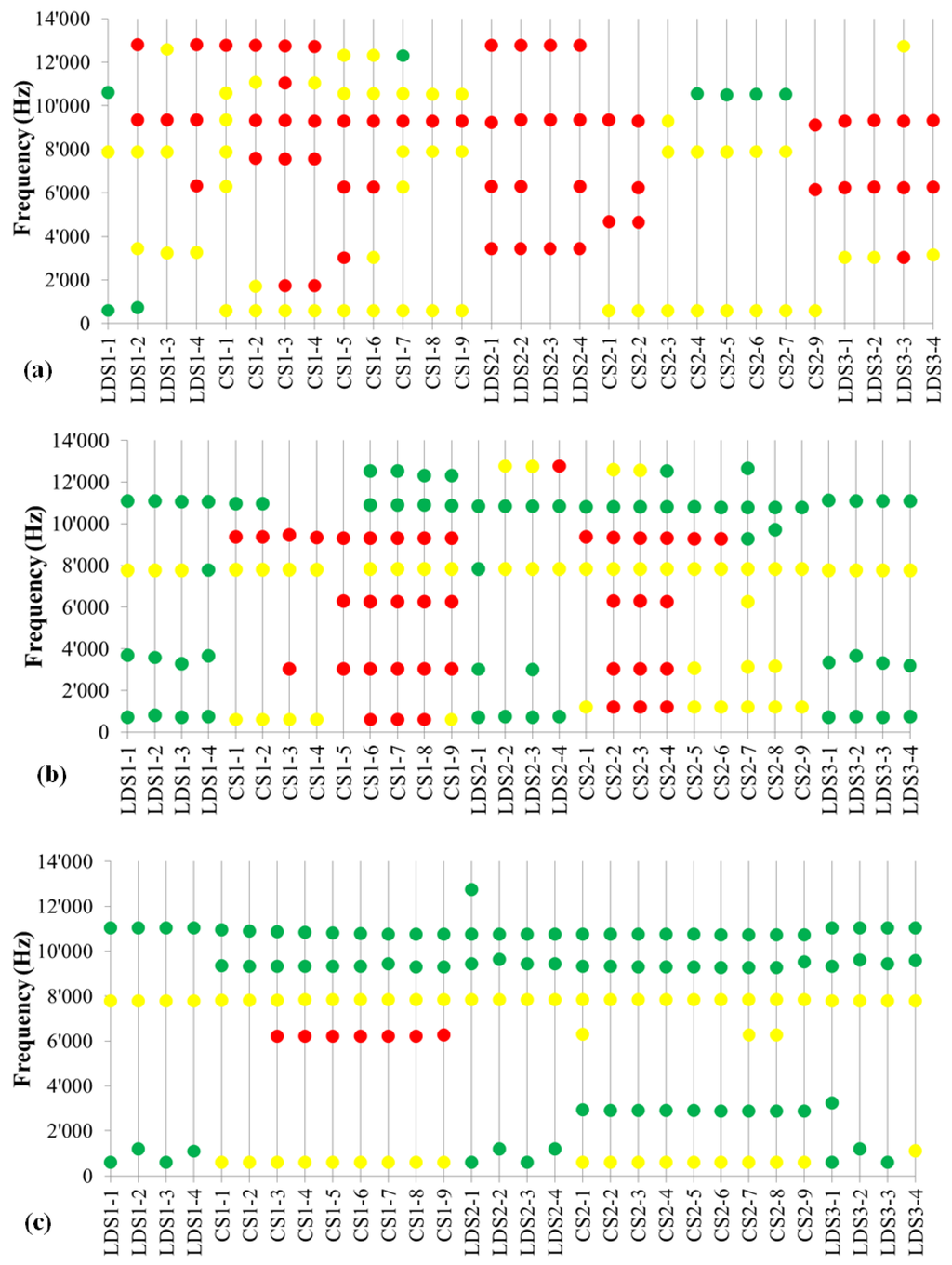 Frequencies and intensities of noise recorded during linear decreasing speed (LDS) and constant speed (CS) tests for: (a) Formulation 4 with 8% T800 graphite; (b) Formulation 5 with 8% T200-2000 graphite; (c) Formulation 6 with 4% T150-600 and 4% C-THERMTM011 graphite. Green dots < 60 dB, 60 dB < yellow dots < 80 dB, red dots > 80 dB. The sequence of the test (x-axis) is described in Table 2.
