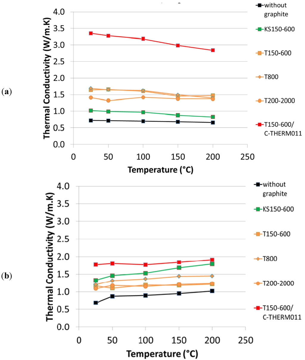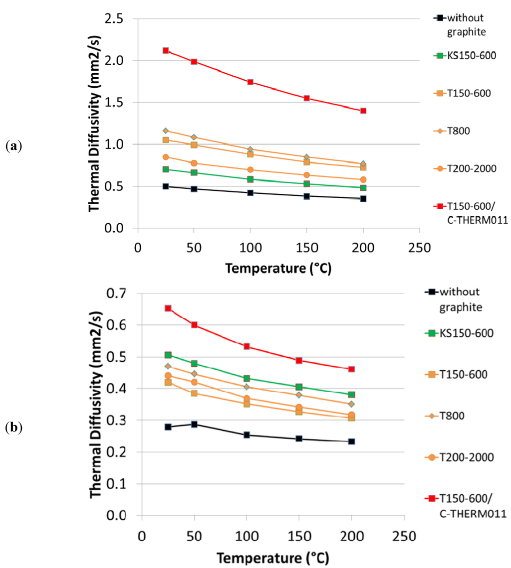 In Figure 3 the thermal diffusivity in both “in-plane” and “through-plane” directions is shown as a function of temperature for the different formulations. For all formulations one observes that the thermal diffusivity decreases with increasing temperatures. However, this effect is compensated by the increasing specific heat as a function of temperature, so that the resulting thermal conductivity is quite constant between room temperature and 200 °C (see Figure 4). For both thermal diffusivity and thermal conductivity, the “in-plane” component is larger than the “through-plane” component, due to the alignment of the graphite particles during compression molding.